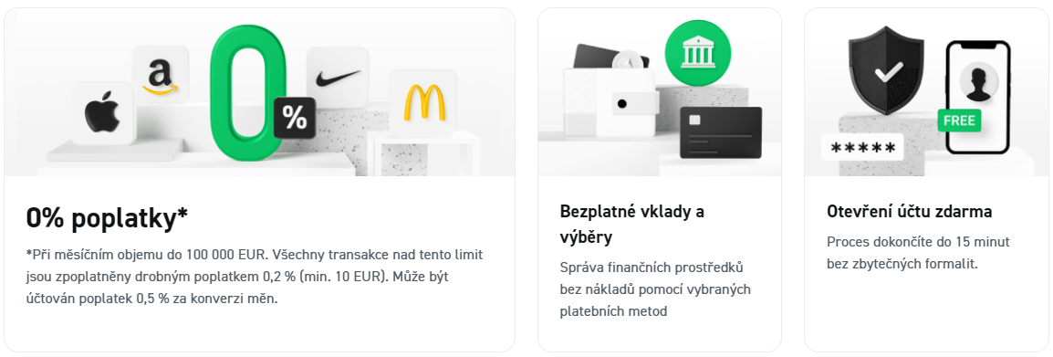 Otevření účtu u XTB je jednoduché a vklady i výběry jsou obvykle rychlé a bez poplatků. XTB nabízí širokou škálu platebních možností, aby vyhověl různým uživatelům. Pro uživatele, kteří zatím přemýšlejí nad investováním nabízí i úrok z neinvestovaných prostředků až do výše 6%, který je vyplácen denně. XTB nabízí širokou škálu platebních možností. Pokud chcete znát další podrobnosti o poplatcích a výhodách tohoto brokera, můžete si přečíst naši podrobnou recenzi.